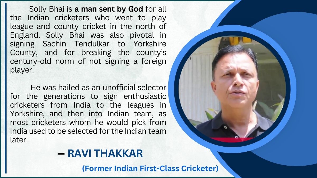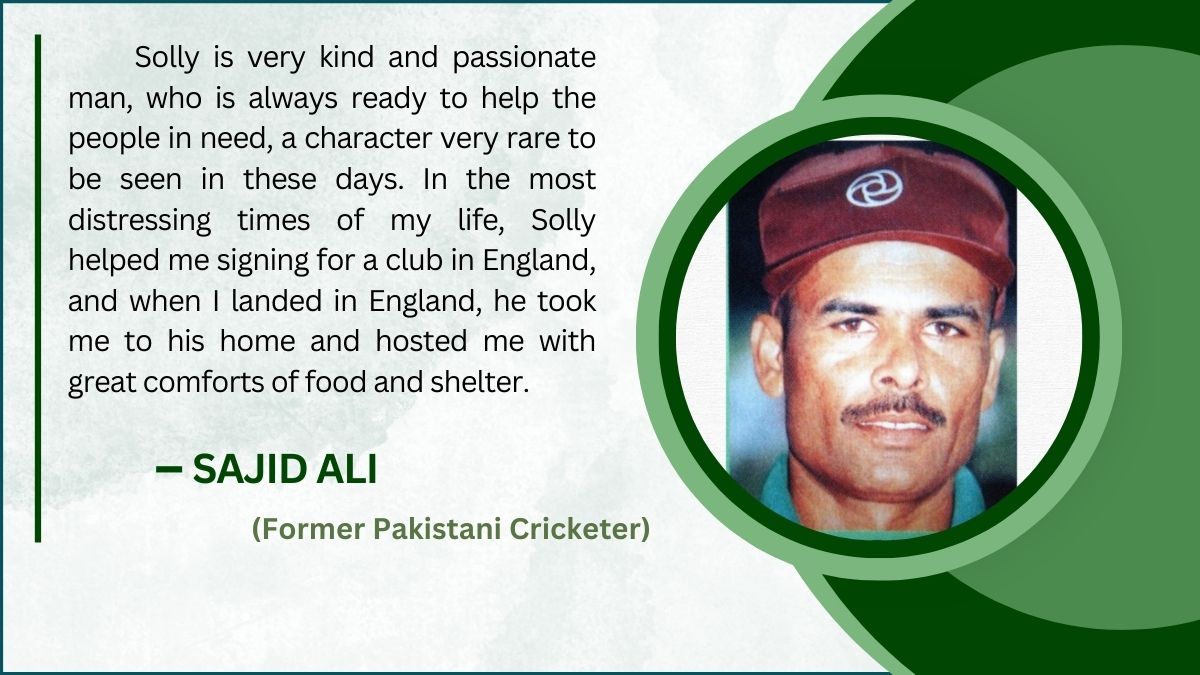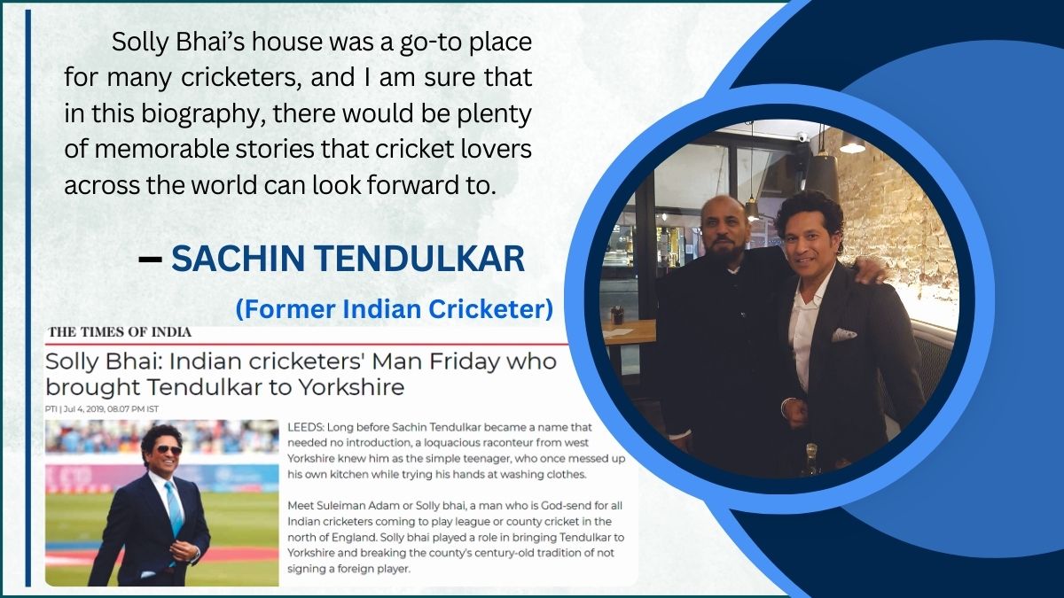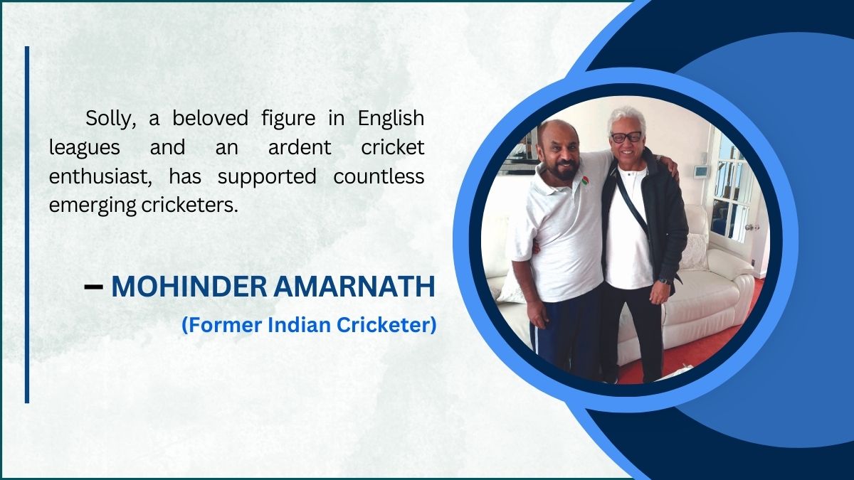 Solly is the man behind securing Sachin Tendulkar's signing with Yorkshire in 1992, a historic move that forever transformed the Yorkshire cricket towards a better unity and a greater inclusivity, and had encouraged many Asians to pursue the sport seriously. He is also a man behind organising numerous benefit/testimonial matches for the well-being of cricketing fraternity. This includes several matches for popular Yorkshire County players such as Sir Geoff Boycott, Richard Lumb, David Bairstow, and Jim Love, among others.