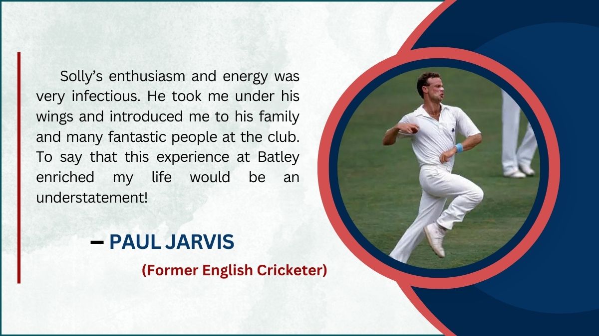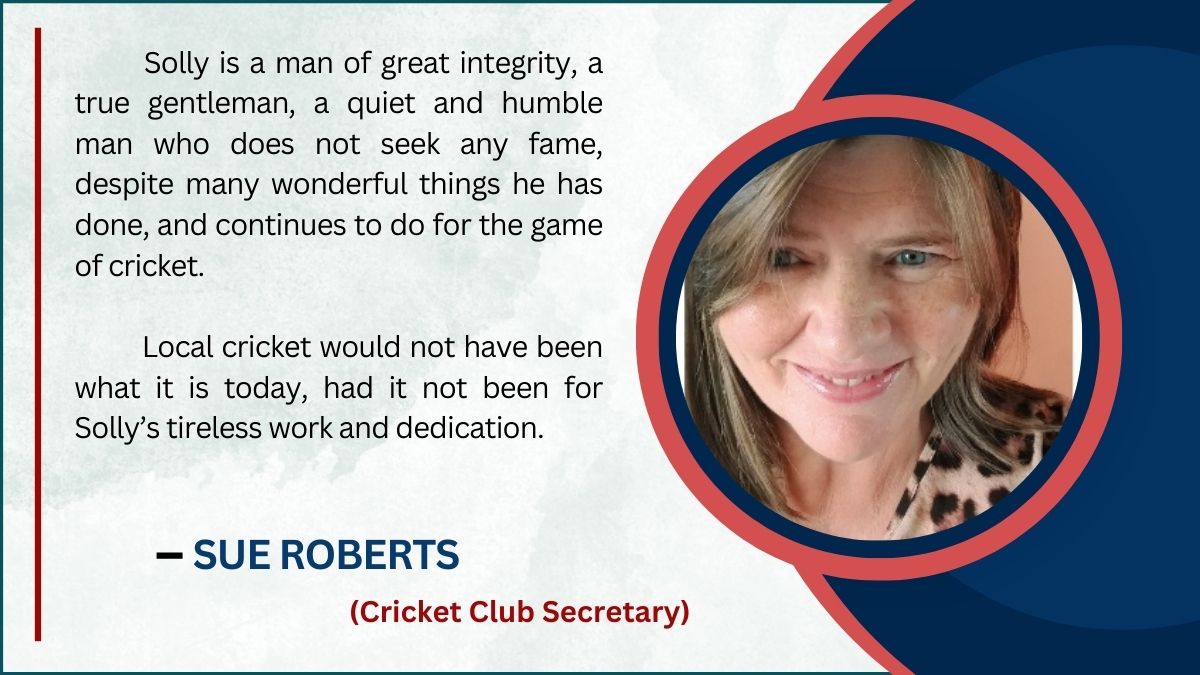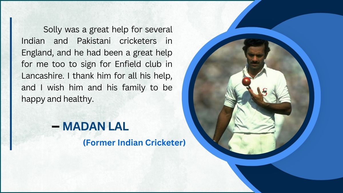The role and significance of Solly for cricket in England has been recognised widely during his active career, and was lauded by the media. The contribution of Solly to cricket had also been recognised by the office of Her Majesty Queen Elizabeth, who bestowed him with the rarest opportunity to be a part of the Garden Tea Party at Buckingham Palace in 2015.